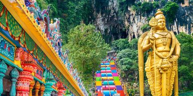 Batu Caves, located just outside Kuala Lumpur, Malaysia, is a famous Hindu temple complex set within impressive limestone caves. A massive golden statue of Lord Murugan stands at the entrance, and visitors climb 272 colorful steps to reach the main cave temple. Along the way, you can admire unique rock formations, take in stunning views, and spot playful monkeys.